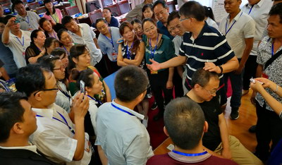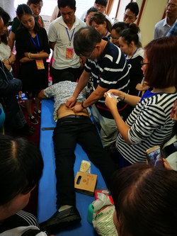 魏教授演示背部點(diǎn)揉法,基層醫(yī)生學(xué)員們將魏教授團(tuán)團(tuán)圍住,邊聽邊看邊記錄,學(xué)習(xí)熱情高漲。演示模特均由學(xué)員自愿擔(dān)任,圖中女醫(yī)生當(dāng)時正好左上腹疼痛,經(jīng)魏教授點(diǎn)揉、拔/走罐等治療后,疼痛立解。立竿見影的治療效果大大提升了醫(yī)生們的信心。