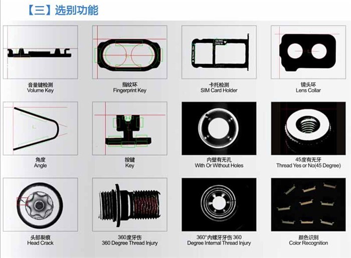 二、設備功能 也就是光學篩選機都能干嘛?檢測些什么項目?一般檢測項目從一個到二十幾個不等。客戶要求的尺寸、外觀、顏色等都是可以檢測的。那具體都可以檢測那些呢?