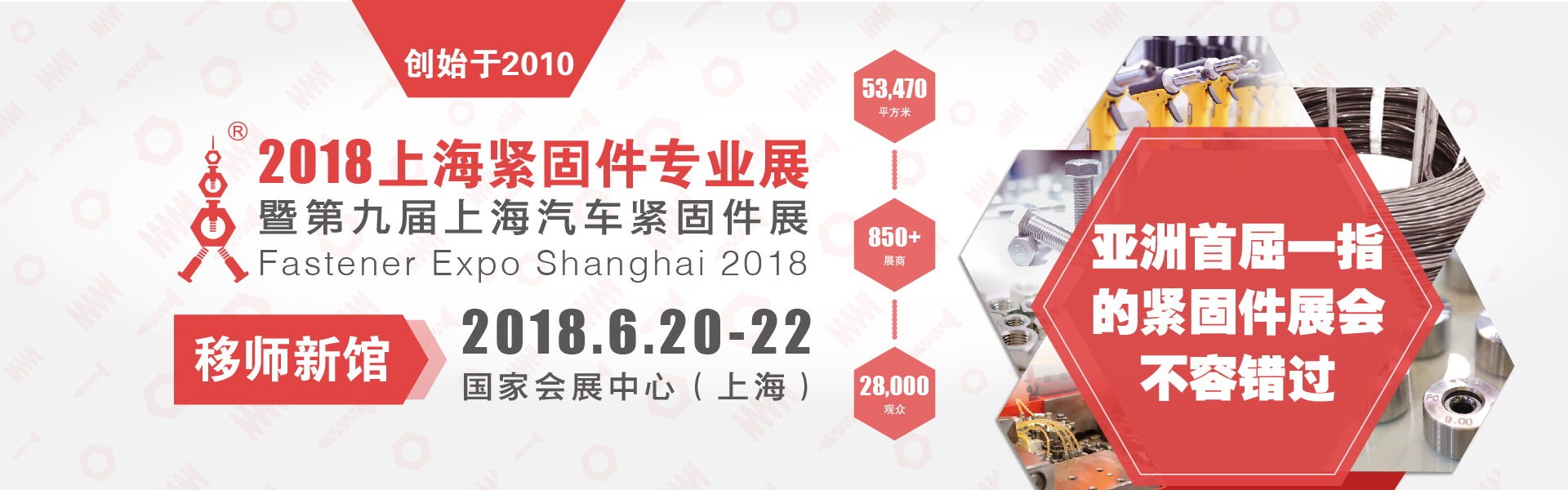 由ITE集團分公司——艾特怡(亞洲)展覽有限公司及上海上搜展覽有限公司聯合主辦的「2018上海緊固件專 業展暨第九上海汽車緊固件展」將于2018年6月20日至22日在上海國家會展中心召開,活動以“先進制造”、“高新材料”、“緊扣終端”為主線引領緊固件行業繼續騰飛。
