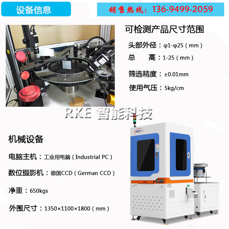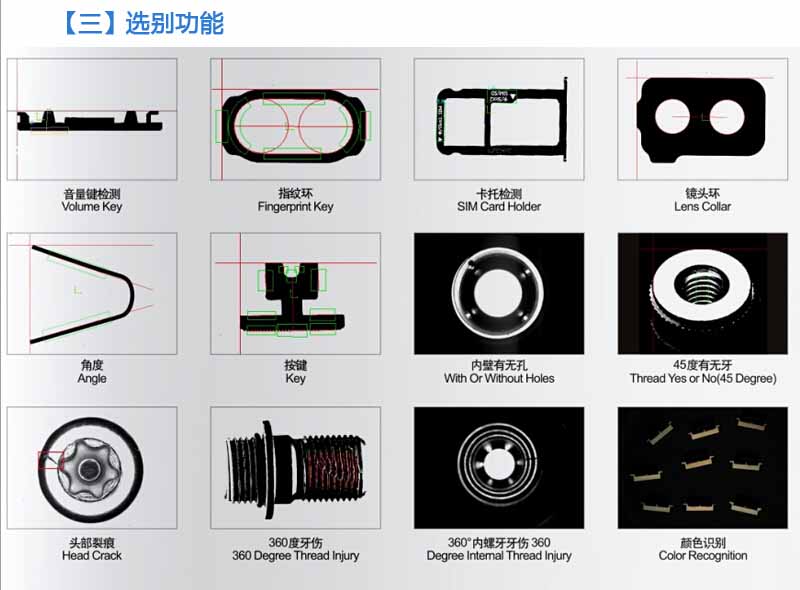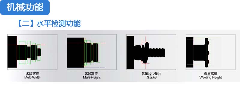 • 本系統檢測功能包括多段高度、多度寬度,斷針、塞孔,無效牙長(頸下牙高),牙底徑,牙外徑,牙距,斜牙、搓牙不良,螺絲長度,頭部有無電鍍,有無倒角,塞孔,偏心,有無牙