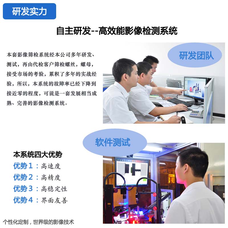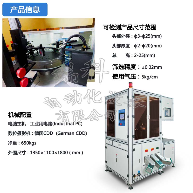 • 本系統檢測功能包括多段高度、多度寬度,斷針、塞孔,無效牙長(頸下牙高),牙底徑,牙外徑,牙距,斜牙、搓牙不良,螺絲長度,頭部有無電鍍,有無倒角,塞孔,偏心,有無牙
